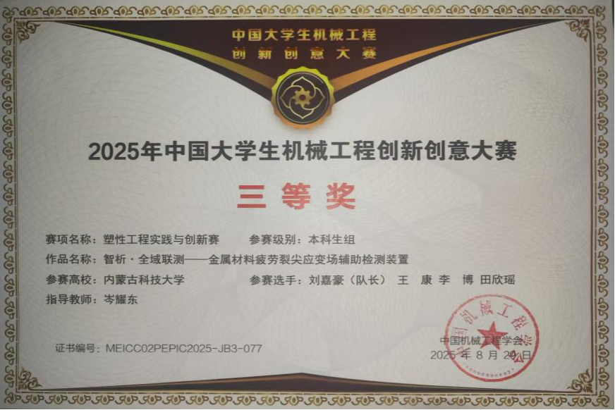 岑耀东副教授指导刘嘉豪、王康、李博、田欣瑶等学生申报的作品“智析·全域联测——金属材料疲劳裂尖应变场辅助检测装置”获得本科生组全国三等奖,这也是我院继2024年获得首届中国大学生塑性工程创新创意大赛以来,再次斩获佳绩。