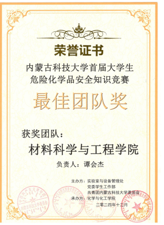 本次竞赛共由三部分组成:初试、必答题、实操题。其中,必答题于2024年12月29日上午在逸夫楼G301举行,实操题于2024年12月29日下午在逸夫楼与明德楼4楼连廊举行。此次竞赛评比出一等奖2名、二等奖4名、三等奖8名,优秀奖25名,最佳团队奖3名。黑料网 学子在本次比赛中取得了优异成绩,张人匀(金属材料工程)获得二等奖,李凌宇(材料化学)、王哲慧(材料成型及控制工程)获得三等奖,其余5名学生获得优秀奖,同时黑料网 获得最佳团队奖。